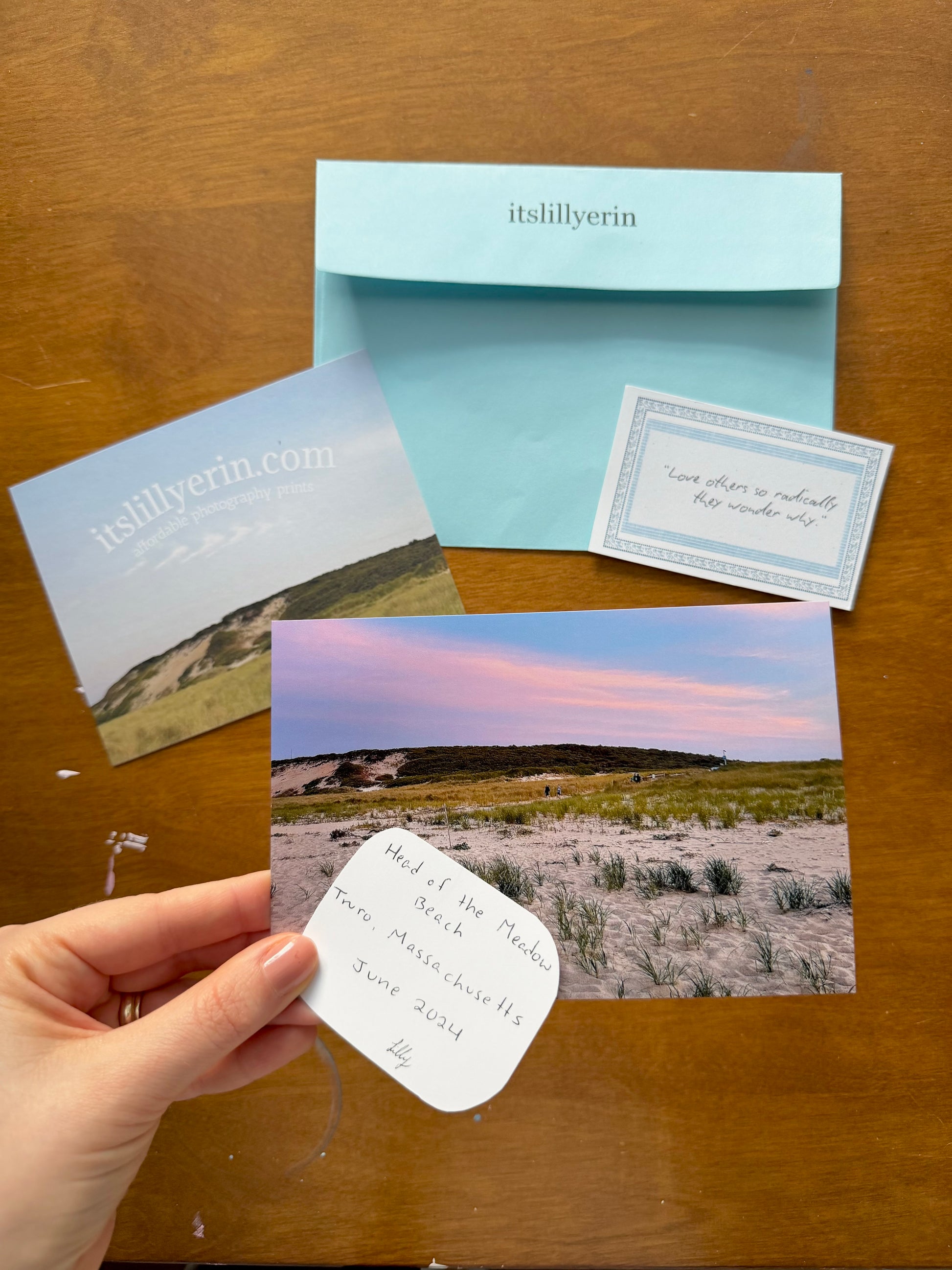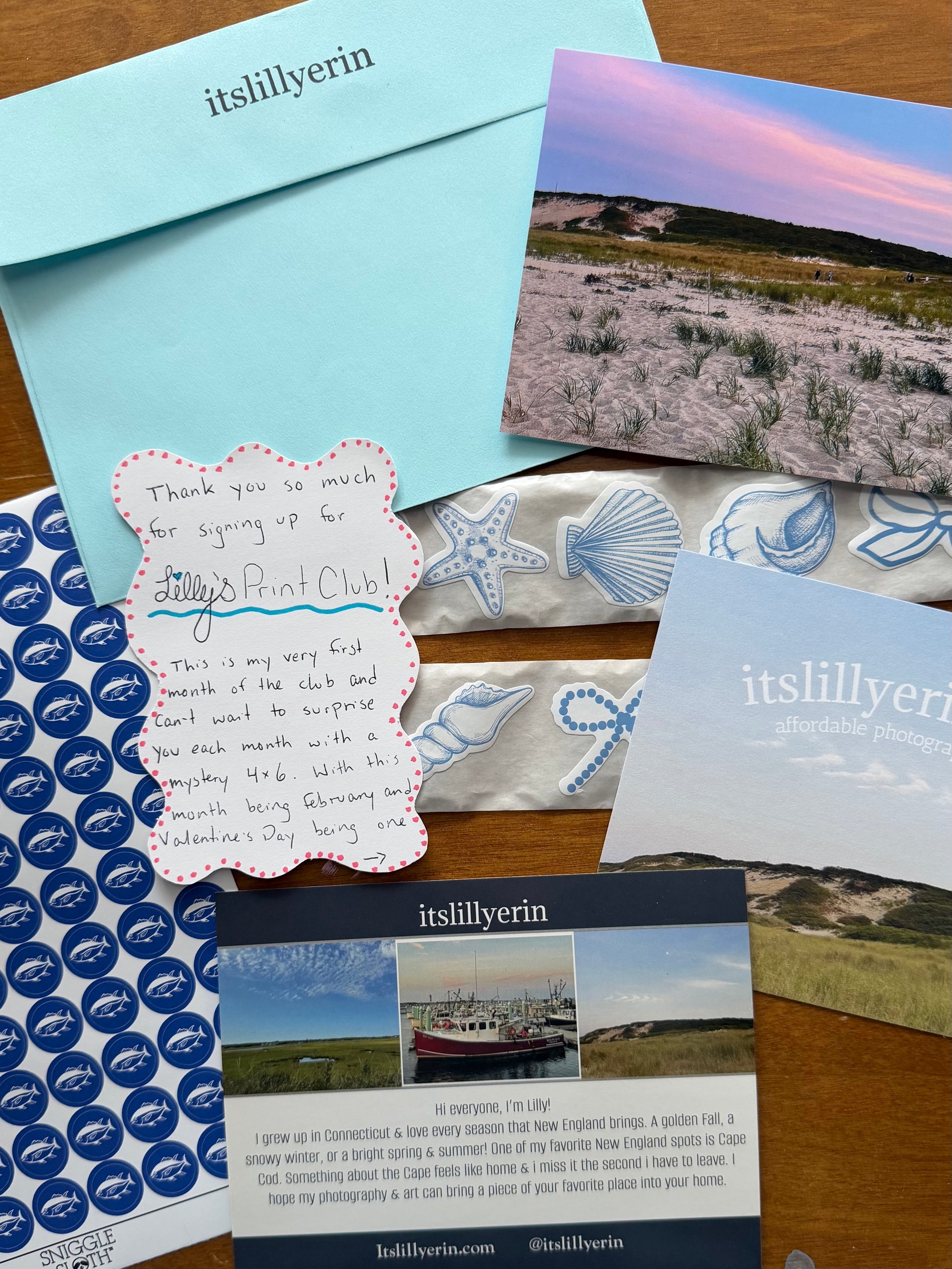 On the first of each month i will mail out a mystery 4x6 print with the story behind the photograph & what it means to me. You’ll also get some coastal stickers & a mini decorate quote print. This is a subscription with a monthly charge of $9. I can’t wait for you to join the club!