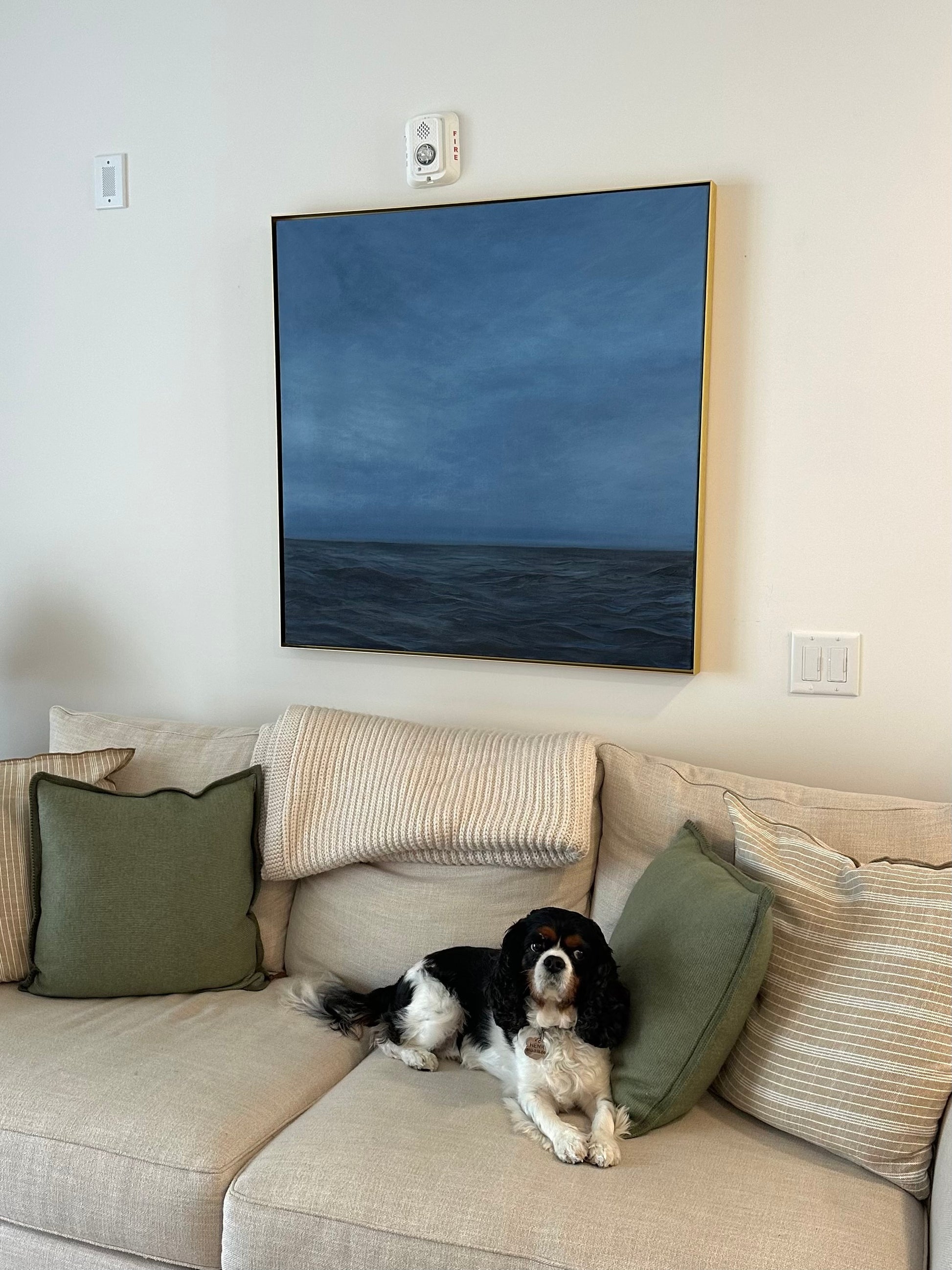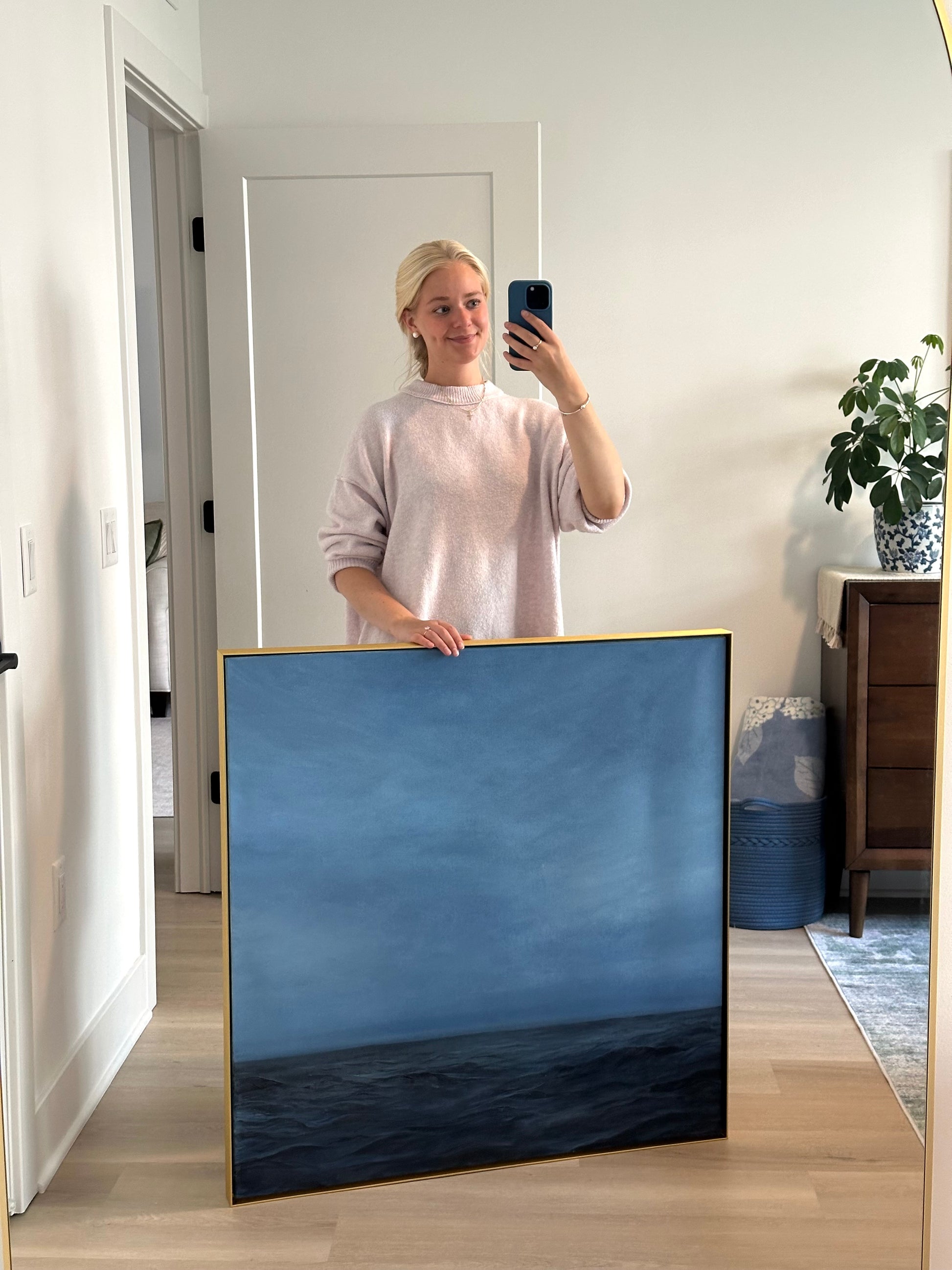 This is an acrylic painting on a 36x36 canvas and framed in a simplistic gold metal frame. Painted by myself in august 2025.
